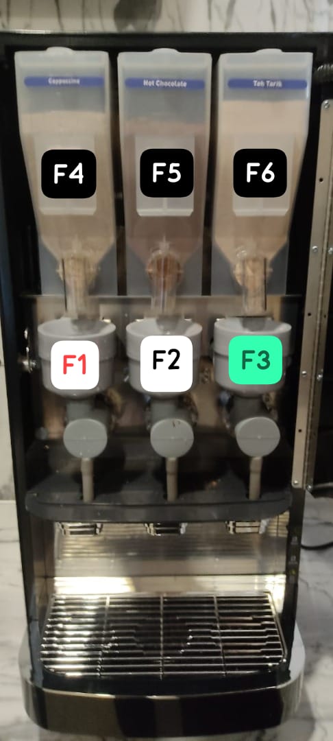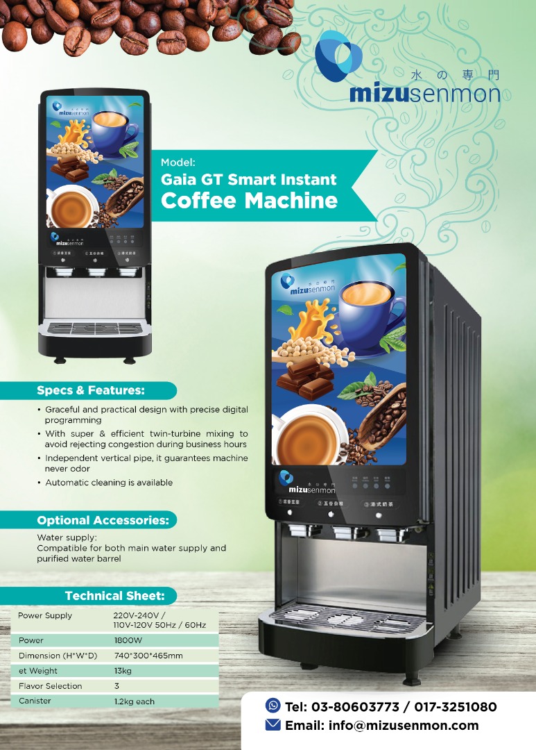| Description – Counter Top Coffee Machine – Hot Beverages : White Coffee, Chocolate, Teh Tarik – 3 Instant Canister (1.5kg powder each) – 3 Selections & Fast Cleaning – Water Tank Capacity : 1.2 Liters |